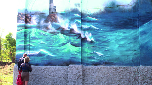 Один из авторов шахтинский уличный художник Денис Лазарев. Как рассказал Денис, картина еще не закончена. Но она уже поражает своими красками и масштабами. На ней терпящий бедствие корабль в бушующем море, и маяк...
