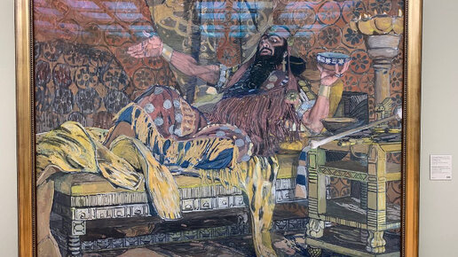 Описание: «Портрет Федора Шаляпина в роли Олоферна» Автор: Александр Яковлевич Головин Дата: 1909г. Размер: 163.5 х 212 см Местонахождение: государственная Третьяковская галерея, Москва Техника: темпера, пастель Материал: холст Что на картине? Шаляпин-Олоферн возлежит на роскошном ложе в пышно убранном шатре, держа в правой руке чашу, а в левой надменным жестом указывая вперёд. Композиция полотна строится по законам станковой живописи, а ракурс модели и произвольное освещение предметов сообщают в работе характер фресковой росписи...