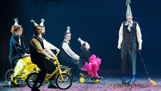 «Фадеев, Калдеев и Пепермалдеев // однажды гуляли в дремучем лесу // Фадеев в цилиндре, Калдеев в перчатках // а Пепермалдеев с ключом на носу» — в «чёрном кабинете» сцены инфернально-нежно катаются на маленьких жёлтых велосипедах странные люди в чёрном, распевая тоненькими голосами известное стихотворение Даниила Хармса, которое он написал 18 ноября 1930 года. Хармсоведы уже не один десяток лет бьются над его расшифровкой, пытаясь нащупать тайный смысл: некоторые видят в нём аллюзии на индоевропейские мифологические символики, другие — описание масонского ритуала...