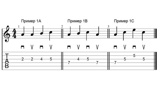Штрихом называется способ извлечения звуков. Применительно к медиаторной технике штрихом называется то, или иное направление движения медиатора. Всего их два: удар вниз, который также часто называют английским термином - «даунстроук» (downstroke), и удар вверх или «апстроук» (upstroke). Переменным штрихом (alternate picking, ПШ) называется строгое чередование ударов медиатора вниз-вверх и т.д., либо вверх-вниз и т.д. Важно именно постоянное чередование ударов на каждую ноту. Пример 1a: 4 ноты на...