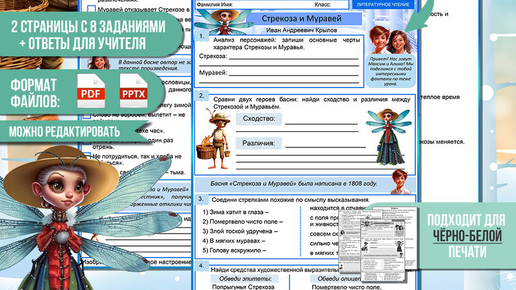 Рабочий лист включает задания по басне И.А. Крылова «Стрекоза и Муравей». УМК «Школа России». На 2-х страницах формата А4 расположено 8 интересных, разноплановых заданий + блок рефлексии. На отдельном листе расположены ответы для учителя. Уникальность данного рабочего листа заключается в присутствии персонажей – второклассников Максима и Алины...