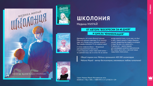 Библиографическое описание "Школония" вышла в сентябре 2022 года в серии “Медина Мирай. Молодежные хиты.” Так как книгу я читала в электронном варианте, ориентироваться могу лишь на данные из интернета, таким образом, объем книги составляет примерно 400 страниц. В Буквоеде цена вопроса 625 рублей. Обложка и иллюстрации Обложка достаточно приятная, а что не менее важно - узнаваема, смотря на нее сразу понимаешь, кто является автором. По неизвестным причинам иллюстрации не вошли в книгу, но имеются в альбоме "Школония" в официальной группе Медины Мирай в вк...