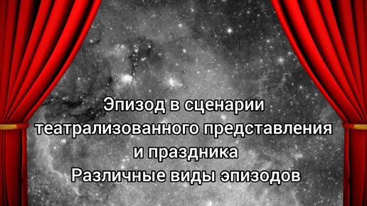 Эпизод в сценарии театрализованного представления и праздника. Различные виды эпизодов. Эпизод является структурообразующим элементом сценария театрализованного представления и праздника, поэтому одна из особенностей сценария в его поэпизодном построении. Чем это обусловлено? Такое строение сценария позволяет рассмотреть вопрос, тему, проблему, явление или личность, заявленные в сценарии, с разных сторон, разных точек зрения. Итак, что же такое эпизод? «Эпизод — это фрагмент драматургического произведения, заключающий в себе структурно законченный момент содержания»...