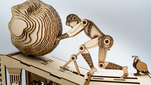 Все слышали выражение "Сизифов труд"? Это отсылка к древнегреческому мифу о царе, который при жизни натворил столько нехорошего, что после смерти был обречен на вечный (и бессмысленный - отсюда и выражение) труд - закатывать тяжелый камень в гору. Художник Росс МакСуинни взял этот миф за основу и разработал кинетическую скульптуру: Пока Сизиф толкает безуспешно толкает свой камень, за ним неотрывно следит стервятник, а под землей вращает шестеренки не иначе как сам дьявол. Все детали выполнены с помощью лазерной резки на станке с числовым управлением (ЧПУ)...