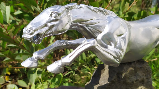 Движение, динамика, эмоциональность данной скульптуры является отличительной чертой. Скульптура "Конь" выполнена в материале гипс, установлена на камне со знаменитого Дюкинского карьера. Тонировка выполнена под хромированный металл и выглядит очень прогрессивно и современно. Храбрые шаги, воплощения мысли в реальность - наш профиль. Скульптура коня изображена скульптором в прыжке, слегка в неестественном движении, пренебрегая физикой во благо пластики и динамики. Виды искусства воплощают жизненные реалии в различных материалах, и скульптура коня тому подтверждение...