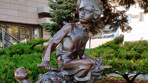 Заглянем в Ростов-на-Дону? Мы были там всего один день, при этом встретили множестве неформальных скульптур, про них и расскажу. Памятник купцу-коробейнику у входа в парк Горького (Большая Садовая, 43). На коробе надпись: «Торгуй праведно - в барышах будешь!» Ближе к вечеру и на коробейнике, и на его верном коте будут восседать десятки людей, а в шесть утра вот так - ни души. Таблички на мостовой - дань спонсорам. С другой стороны от входа в парк - закалённая Цветочница с корзинкой незабудок. Горожане называют монумент «Девушка с мороженым»...