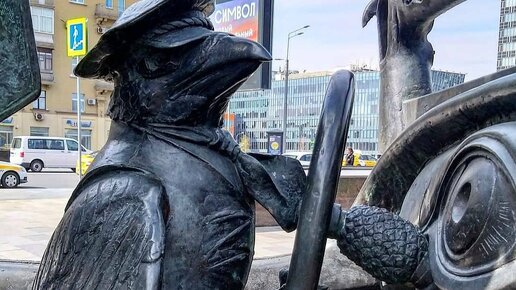Скульптура Мастер и Маргарита - совершенно удивительная и необычная композиция города Москвы. Мастер, Маргарита и машина Машину опишу вам детально: на крыльях машины растут перья; внутри обивка - чешуя; колёса прокрыты узором карточных мастей; складная крыша - клещни; вместо спидометра - глаз; сиденье - морская раковина; лобовое стекло - часть швейной машины, а из задних фар торчат ладони с лампочками. А как вам сам шофёр? Шедевр – не правда ли? Машину, описанную Михаилом Булгаковым в сцене возвращения Маргариты с шабаша, воплотил в бронзе скульптор Александр Руковишников...