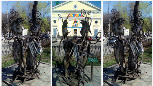 Если идти от Камы по пешеходной аллее Комсомольского проспекта, то можно встретить несколько симпатичных скульптур. Появились они тут после проведения фестиваля современной пластики "Сезон искусства". Скульптура "На подлёте" создана из металлолома пермским скульптором. Представляет собой аиста, который несёт младенца. Среди пермяков сложилось поверье, что если посидеть под памятником, то можно в скором времени ожидать пополнения в семействе. Называется сиё творение "И была древняя легенда", установлена напротив детского развлекательного центра Октябрь...