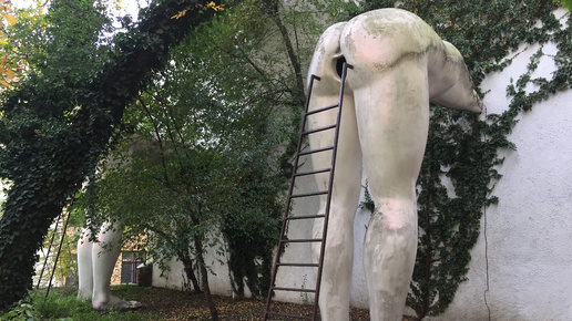 Итак, следующая странная и шокирующая скульптура в Праге - "Подхалимство". Это и скульптурой не назовёшь. Можно просто назвать инсталляцией. Как вы уже догадались, автор этих инсталляций всё тот же чешский скульптур-авангардист Давид Чёрный. Она стоит у меня на втором месте в списке странных скульптур Праги, после «Писающих мужчин». 5 метровые мужчины уперлись руками в стену под прямым углом и выставили напоказ то место, куда подхалимы готовы влезть, лишь бы угодить или подлизаться. У скульптур нет голов...
