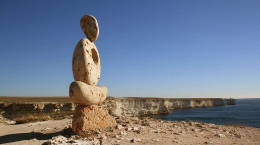 ✨ В рубрике «Достопримечательности» — невероятная скульптура «Мыслитель. Сердце Тарханкута», которая органично вписалась в живописный природный ландшафт мыса Тарханкут. 🏞🗿 Это уникальное произведение искусства высотой около трёх метров было создано питерским скульптором Александром Китом и открыто в 2013 году. Скульптура представляет собой композицию из трёх больших камней, сложенных друг на друга, напоминающих человека, сидящего в позе лотоса. Она символизирует гармонию и единство человека с природой...