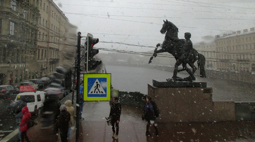 Фото автора. Аничков мост, вид из автобуса Кони Клодта на Аничковом мосту через Фонтанку – гордость Петербурга. Этот шедевр создал Петр Карлович Клодт, потратив на создание скульптур около 20 лет. Вначале в 1832 году планировалось украсить конями Университетскую набережную. Затем планы поменялись, и на набережной поставили сфинксов XIII века, доставленных из Египта. Фото автора...
