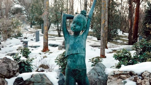 » 🔆 в японском саду парка. ⠀ 🔥⬇️ “Бронзовая девочка застыла на грани между ночью и рассветом —чистая, открытая, как сама душа в момент её пробуждения. Её фигура, устремлённая к солнцу, становится живой метафорой той невинной части нас, что каждый день⠀ рождается заново, ещё не тронутой тревогами и сомнениями.⠀ ⠀ В её поднятых руках — первозданная доверчивость к миру. Она раскрывается⠀на встречу утру, как цветок, ещё не знающий о возможных бурях. Это момент совершенной искренности, когда душа, подобно ребёнку, готова принять весь мир целиком — без страха и предубеждений...