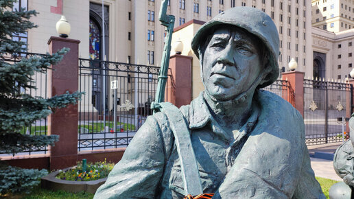 Каждая фигура из этой скульптурной композиции легко узнаваема. Герои настолько реалистично сделаны, что кажется, только что сошли с киноэкрана. Это тот самый случай, когда слова излишни. На табличке написано «Герои к/ф С. Бондарчука "Они сражались за родину": Вячеслав Тихонов, Сергей Бондарчук, Василий Шукшин, Георгий Бурков, Юрий Никулин». Просто взгляните на них: Авторы — Студия военных художников имени М.Б. Грекова. И пересмотрите сегодня этот фильм...