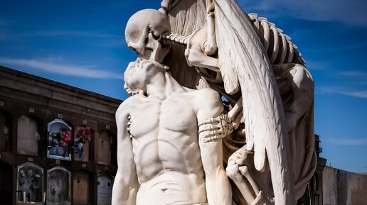 «Поцелуй смерти», Барселона, Испания «Поцелуй смерти» — скульптура, установленная на могиле молодого человека, умершего в 30-х годах прошлого века. Об ее авторстве до сих пор идут споры. По одной из легенд, скульптура вдохновила Ингмара Бергмана на фильм «Седьмая печать»...