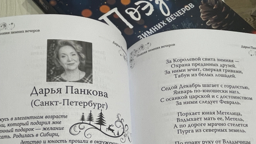В последних числах декабря получила посылку от Издательского Дома "АРТ-Сияние". Это был прекрасный новогодний подарок — сборник стихов "Поэзия зимних вечеров", в котором я была среди авторов. Было очень приятно увидеть свои мысли в стихотворных строках и хотя это уже третий сборник, но новизна не пропала. Есть в этом ни с чем несравнимая чудодейственная магия — моё трепетное отношение к любой книге, многократно увеличенное ощущением авторской причастности. Год закончился с благодарностью и надеждами на рождение новых стихов...