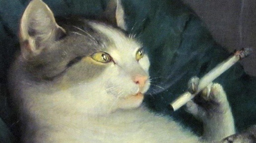 »" Викентий Слендзинский, детали картины, 1867. Викентий Александрович Слендзинский (2 января 1838 — 6 августа 1909) — польский живописец и пианист, сын художника Александра Слендзинского, отец художника Людомира Слендзинского. В центре композиции — пушистый серо-белый кот, который лениво растянулся в глубоком зеленом кресле. Эта поза напоминает непринужденный досуг человека, полностью довольного моментом. В правой лапе кот держит зажженную сигарету, кончик которой слабо светится в спокойном внутреннем свете...