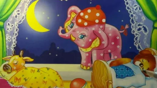 Пришло время ложиться спать. И вот уже бычок лег в коробку на бочок и уснул. Потом сонный мишка лег в кровать, но вот только слон совсем не хочет спать. Он качает головой и так он слонихе шлет поклон...
