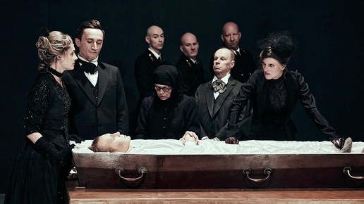 Слепящий свет рамп, сменяемый абсолютной, стопроцентной тьмой, в которую дважды погружают зрительный зал. Черно-белое решение сцены. Минимализм передвижных конструкций. Фирменный стиль Валерия Фокина угадывался с начала спектакля и выдерживался до конца. Все действие разворачивается вокруг гроба, поставленного на постамент на колесиках и вертящегося по сцене. Словно это не гроб, а игрушка. Наподобие того мячика, которым перебрасывается Иван Ильич с сыном Васей, чтобы в разгаре игры вдруг схватиться за левый бок и вспомнить, что он вообще-то умирает...
