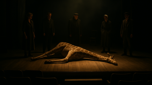 Когда всё уже случилось — а ты ещё не понял, что именно Представьте: огромный зал. Почти тишина. Свет падает как из-под века. На сцене — жираф. Он лежит. Не двигается. И никто не знает, что с этим делать. Это не спектакль. Это замедленное чувство. Слепой разговор о том, чего нельзя потрогать. Крымов снова поднимает зрителя выше его самого — туда, где театр перестаёт быть действием и становится дыханием. Люди в зале смеются. Кто-то даже хихикает. Сцена — почти фарс, почти цирк. А жираф лежит. Вот приходит один — с дипломом...