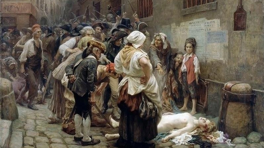 Опьяневшая от бесчинств толпа беснуется над поверженной жертвой, обагрившей кровью булыжную мостовую. Обнажённая женщина уже мертва, но расправа над ней ещё не закончена.