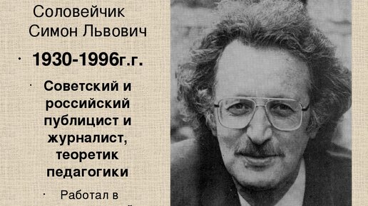 Симон Соловейчик-советский и российский публицист, преподаватель, теоретик педагогики, журналист. Родился 1 октября 1930 года.