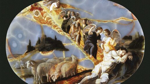 Сон Иакова, описанный в двадцать восьмой главе Книги Бытия, один из самых широко распространенных сюжетов у живописцев. Избегая мести брата Исава, высказавшего своё желание его убить, Иаков, по совету своей матери Ревекки, удалился в город Харран. По его словам, в тот момент он имел с собой лишь один дорожный посох, а голову для сна преклонял на камнях. В одну из ночей Иаков увидел во сне мистическое видение - лестницу, соединяющую землю и небо, по которой поднимались и спускались ангелы. Его сон известен сейчас как Лестница Иакова...