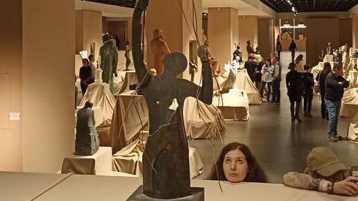 Люди как скульптуры и скульптуры как люди. Это было мое первое впечатление, когда вошла в выставочный зал. Задрапированные постаменты в цвет стен создавали ощущение единого пространства. Плавкого, изменчивого. Деликатное освещение высвечивало фрагменты, а фланирующие среди скульптур люди часто так вписывались в композицию скульптур, словно были их частью. Возникает диалог, зрители становятся участниками этого действа. Они вступают в отношения с каждой скульптурой: наклоняясь ближе, протягивая руки с камерой, будто фотографируют близкого человека...