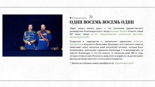 В репертуаре Александринского театра вновь появился спектакль по пьесе Бориса Акунина* «Один восемь восемь один» («1881»). Однако когда можно будет на него попасть — пока неизвестно. При попытке приобрести билет на сайте театра появляется надпись: «Даты показов пока не определены». На данный момент можно только оставить заявку и ждать письмо о том, когда они поступят в продажу. Напомним, впервые спектакль был показан 9 сентября 2022 года. И, как утверждалось на сайте театра до конца лета 2023 года, он был «основан на исторической пьесе Бориса Акунина*»...