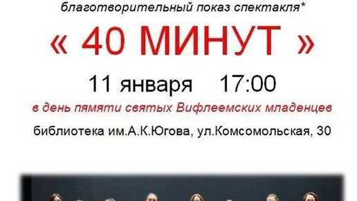 В Кургане 11 января, в день памяти Вифлеемских младенцев, в 17:00 в областной библиотеке имени Югова состоится благотворительный спектакль "40 минут". Жителей и гостей Кургана приглашают на показ. Спектакль посвящен материнству. Он основан на реальных событиях: историях женщин, вставших перед выбором – сделать аборт или принести в мир новую жизнь. Театральная постановка создана при содействии православного Центра защиты семьи, материнства и детства «Обитель милосердия», в ней заняты артисты театра Анастасии Лушниковой...