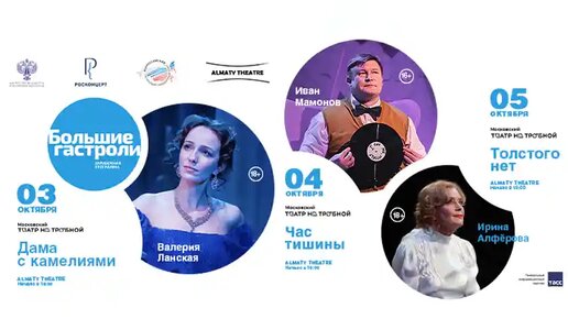 С 3 по 5 октября на сцене Almaty Theatre пройдут Большие гастроли Московского театра на Трубной — масштабное событие, которого Алматы не видел много лет. В рамках гастролей зрители смогут увидеть три постановки с участием известных российских актёров: Ирины Алфёровой, Владимира Шульги, Валерии Ланской, Ивана Мамонова, Дмитрия Астрахана и других...