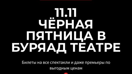Только 11 ноября купите билеты на все спектакли Буряад театра за полцены! 11 ноября с 00:00 до 23:59 на сайте burdram.ru и с 10 до 18:30 в кассе театра вы сможете приобрести билеты на все спектакли со скидкой 50%. Промокод объявят накануне в Телеграм-канале Буряад театра. Купить билеты могут все, включая владельцев «Пушкинской карты»! Какие постановки и премьеры будут доступны за полцены? 🧐 🎭 «Хугшэн эжыдээ», 12+ Лирическая комедия по пьесе Вячеслава Дурненкова и Юрия Алесина «На деревню к бабушке» — спектакль для школьников, взрослых и семейного просмотра...