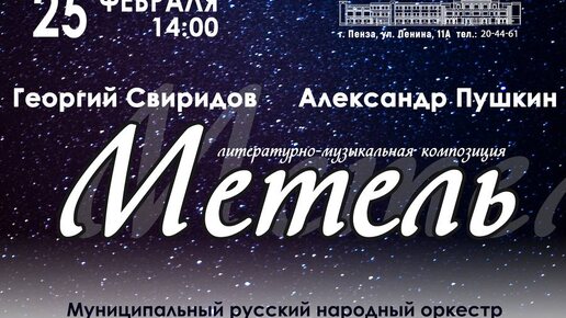 "❄ 🎶 В исполнении Русского народного оркестра "Пенза" им. В.Н. Попова зрители услышат музыкальную иллюстрацию композитора Георгия Свиридова к повести Александра Пушкина «Метель», состоящую из девяти музыкальных композиций: «Тройка», «Вальс», «Весна», «Осень», «Романс», «Пастораль», «Военный марш», «Венчание», «Отзвуки вальса», «Зимняя дорога»...