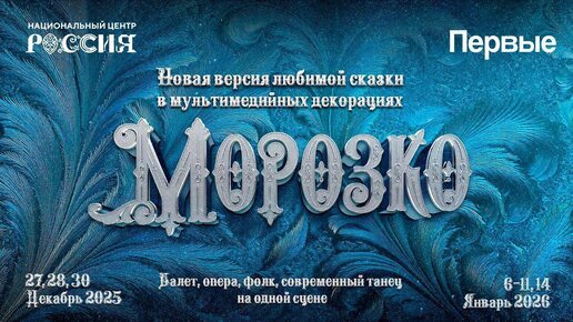 » С 27 декабря по 14 января | Национальный центр «Россия» Уникальный авторский спектакль «Морозко» — увлекательная новогодняя история, в которой переплетаются магия, традиции и семейные ценности. В постановке сочетаются традиции и современные формы. Она объединит оперу и балет, народный танец и современную хореографию. Вы увидите, как оживут картины, вдохновленные творчеством Виктора Васнецова и Ивана Билибина, а также советской и современной мультипликацией. А саму историю расскажет бабушка-сказочница вместе с умной колонкой Анфисой...