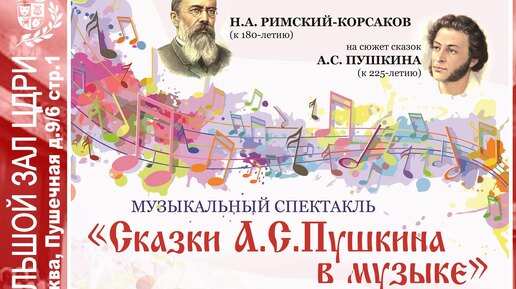 Музыкальный спектакль «Сказки А.С. Пушкина в музыке» Приглашаем взрослых и детей на «Сказки А.С. Пушкина в музыке» — музыкальный спектакль с фрагментами из сказочных опер Николая Римского-Корсакова по сказкам Александра Сергеевича Пушкина «Сказка о царе Салтане», «Садко», «Золотой петушок», «Шехерезада». В этом году празднуются юбилеи А.С. Пушкина (225-летие) и Н.А. Римского-Корсакова (180-летие). Их творчество — достояние отечественной культуры, а сказки — пример для подрастающего поколения...