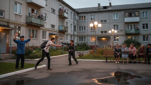 Вечером в городе М во дворе дома на Песочной улице показали короткий уличный спектакль «Шурик: дубль во дворе» — без сцены, зато с лестницей, балконом и соседями в роли живых декораций. Постановку собрала местная труппа «Третий подъезд»: 35 минут, вход за 250 рублей или «как не жалко» в коробку из-под обуви. Я стоял у лавочки рядом с бабушками, которые сначала ворчали на шум, а потом попросили «ещё раз тот момент с сумкой». Поводом стали разговоры вокруг «приключения шурика 2025»: тему здесь вспоминают то в афишах, то в школьных чатах, где спорят, «можно ли переснимать классику руками»...