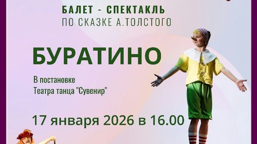 ✨ Балет - спектакль «Буратино»🎭 по мотивам сказки А.Н. Толстого «Приключения Буратино» Балет - спектакль «Буратино» – это феерия танца и музыки, переносящая зрителей в чарующий мир сказки. На сцене оживают любимые с детства персонажи: Папа Карло, Буратино, Мальвина, Пьеро, Артемон, Дуремар, черепаха Тортилла, Кот Базилио, лиса Алиса и конечно же хозяин кукольного театра – Карабас Барабас. Чудесная музыка, изысканные хореографические...