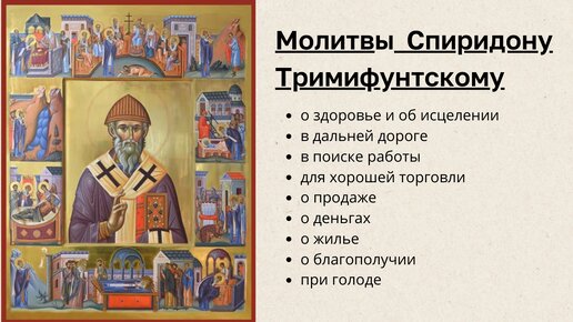 Молитвы к святому Спиридону Тримифунтскому считаются мощными и эффективными, и многие верующие свидетельствуют о том, что они получили помощь и ответы на свои молитвы через его заступничество. О чем просят Молитва о помощи 1-ая О, всеблаженный святитель Спиридон, великий служитель Христов и преславный чудотворец! Предстоя на небесах престолу Божию с сонмами Ангелов, воззри милостивым оком на предстоящих здесь людей и просящих сильной твоей помощи. Умоли милосердие Человеколюбца Бога, да не осудит...