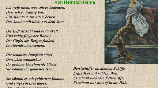 Впервые стихотворение "Лорелея" Г. Гейне я прочитала и выучила в 8 классе на уроках немецкого языка. Благодаря нашей замечательной учительнице мы читали не только Г. Гейне , но и И. Гёте, Ф. Шиллера , конечно, не в оригинале. Лишь отдельные произведения , чаще стихотворения , учили наизусть на немецком языке. Когда училась в Горьковском институте иностранных языков, первое произведение, которое мы тщательно учили на вводно-фонетическом курсе - это "Лорелея" Генриха Гейне. Образ Лорелеи, нимфы расчёсывающей волосы на скале и увлекающей своим пением корабли на скалы, создал в 1802 г...