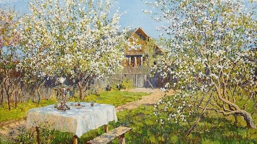 - Весна утром рано Солнцу улыбнулась. От лучей его сразу Ярких проснулась. Светом чистым залила Сад уже цветущий, Освежила деревца Белым цветом лучше. - Засияли белизной Яблони нарядно. Аромат весне собой Посылая явный. - Заблестел и самовар Весело сверкая, Ожидая всех на чай, Горячо сияя. С ароматом яблочным Чай весны бодрящий Наливал сад радостью И весной творящей! - - Автор, Стулова Ольга (Катина) Поэтическая зарисовка к картине: " Цветущие яблони "... Современного российского художника, мастера пейзажа и натюрморта, Владимир Вахмянин...