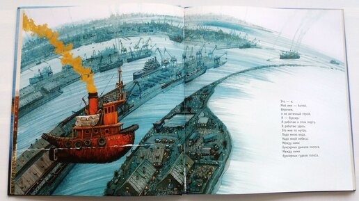 Это — я. Мое имя — Антей. Впрочем, я не античный герой. Я — буксир. Я работаю в этом порту. Я работаю здесь. Это мне по нутру. Подо мною вода. Надо мной небеса. Между ними буксирных дымков полоса. Между ними буксирных гудков голоса. Я — буксир. Я работаю в этом порту. Это мой капитан с сигаретой во рту. Он стоит у штурвала (говорят — за рулем). Это мой кочегар — это он меня кормит углем. Это боцман, а это матросы. Сегодня аврал. Это два машиниста — два врача, чтобы я не хворал. Ну, а кто же вон там, на корме, в колпаке? Это кок с поварешкой прекрасной в руке...