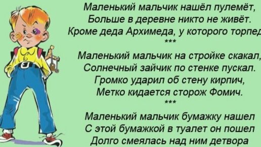 Mаленький мальчик веревку нашел С этим предметом он в школу пришел Долго смеялись глупые дети Синий директор висит в туалете. 😂😂😂 Маленький мальчик нашел пистолет. Долго он целился папе в хребет. Грянул тут выстрел - папа упал. Мама спросила: "Hеужто попал?" 😂😂😂 Маленький мальчик варенье варил, Вместо лимона лимонку ложил. Мама решила попробовать пенки, Долго кишки отдирали от стенки. 😂😂😂 Маленький мальчик по стройке гулял, Маленький мальчик со стройки упал. Долго смеялись собаки и кошки, Как шевелятся глаза у лепешки...