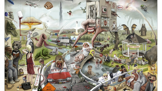 Картина под названием «Страна Кинга» («Stephen King's Country»), которую я покажу вам сегодня, создана американским художником Джорданом Монселлом. Изображение представляет собой коллаж из множества узнаваемых сцен и элементов из вселенной «Короля Ужасов». Монселл спрятал на полотне 171 отсылку к произведениям, персонажам и монстрам из книг Стивена Кинга...