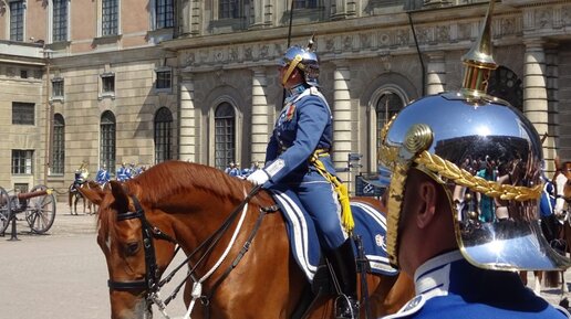 В этой поездке мы посмотрели еще одну новую церемонию — смену караула у Королевского дворца в Стокгольме. Очень необычное зрелище, потому что обычно подобные действа длятся всего несколько минут, а здесь — больше часа. И участвуют в этом вот такие красивые гвардейцы. Кстати, среди них не только мужчины, но и девушки. Здесь не принято подбирать людей по росту, поэтому выглядит строй довольно непривычно. Примерно четверть времени занимает речь на трех языках, далее — торжественное шествие, затем — выход конницы и оркестра...