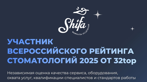 Друзья, спешим поделиться важной новостью: Многопрофильный медицинский центр SHIFA на Ломоносовском вошел в ТОП-8 престижного рейтинга «32top» за 2025 год!