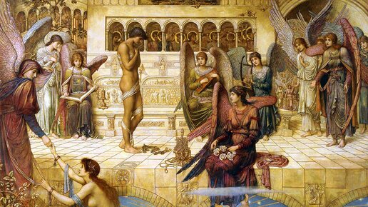 Свет. Свет везде. Золотой свет. Золотые стены. Золотые деревья с золотыми листьями, нежно шелестящими на ветру. И голый человек среди одетых людей с крыльями. Человек среди ангелов, в их абсолютной красоте, в их вневременном совершенстве. Такой предстает перед нами картина Джона Мелхуиша Струдвика "Бастионы Божьего дома". Когда художник Джон Мелхуиш Струдвик (1849–1937) написал эту картину, ему был сорок один год. Даже ничего не зная о художнике, можно сказать, что это настоящее произведение искусства прерафаэлитов...
