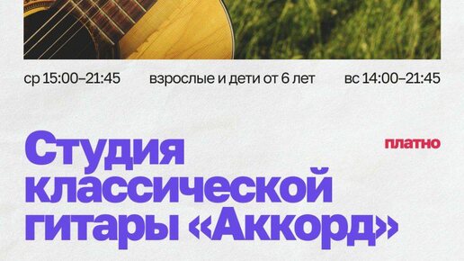 🎸 Студия классической гитары «Аккорд» ✨ Открой мир музыки вместе с нами! Почему именно гитара? Гитара — это уникальный инструмент, возможности которого безграничны: 🎶 классическая музыка 🎷 джаз 🔥 фламенко 🎸 рок и поп-музыка 🎤 авторская и бардовская песня Она мобильна — её всегда можно взять с собой и подарить миру свою музыку! Программа обучения: 🟡 основы классической игры на шестиструнной гитаре 🟠 нотная грамота 🟡 вокал под гитару 🟠 бардовская песня и аккомпанемент 🟡 аккорды, буквенные обозначения 🟠 разные стили: фламенко, рок, поп, джаз и др...