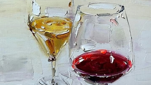 Чудесный в своем минимализме натюрморт. Все условия, чтобы рассмотреть во всей красе изящные, прямо-таки антагонистичные формы двух бокалов, насладиться ярким, насыщенным цветом напитков, полюбоваться переливами света и его мерцанием...
