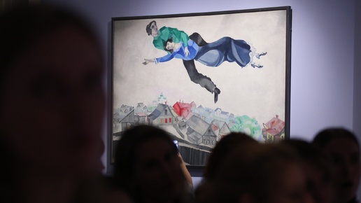 Если театр начинается с вешалки, то выставка "Марк Шагал. Радость земного притяжения" (куратор Евгения Петрова) в ГМИИ им. А.С. Пушкина начинается с лестницы. Поднимаясь по мраморным ступеням к знаменитой шагаловской "Прогулке", привезенной из Русского музея в Москву, обнаруживаешь, что не только Белла Шагал в фиолетовом платье летит-парит над зеленым городом Витебском, держась за руку Марка (кажется, лишь чтобы не улететь ввысь), но и над нашими головами взмыли ввысь скрипка и альт, виолончель и флейты, а из-за античной колонны являетcя тень козочки...