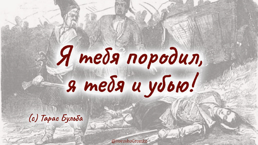 ... или знаменитые цитаты из «Тараса Бульбы», часть 2. Кто, кстати, был в курсе, что это из «Тараса» цитата? В прошлый раз обсудили первую половину повести Гоголя «Тарас Бульба» и знаменитую из неё цитату - «Терпи, козак, - атаман будешь!». Сегодня вторая половина «Тараса» и вторая, и, наверное, самая знаменитая Гоголевская цитата: Я тебя породил, я тебя и убью! «Тарас Бульба» - повесть выдающегося писателя XIX века Николая Васильевича Гоголя, где события происходят на фоне восстания запорожских казаков против поляков...