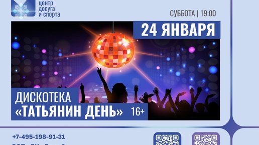 ! ✨ Дорогие друзья! Приглашаем вас погрузиться в атмосферу музыки и движения на нашей праздничной дискотеке. Вечер посвящён праздникам «День студента» и «Татьянин день». 💃🕺 Вас ждут зажигательные танцы и атмосферная музыка, которая не даст усидеть на месте...